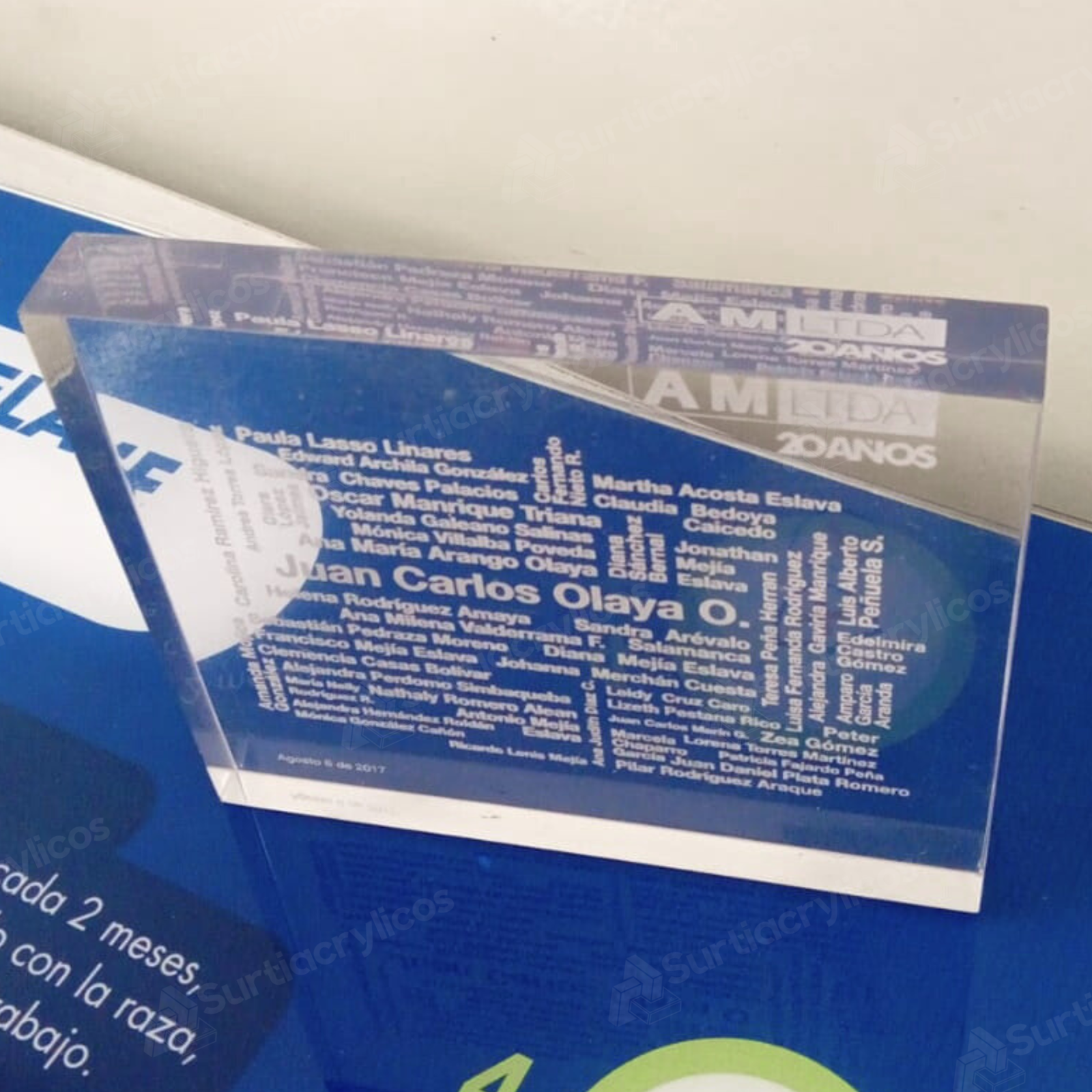 La placa de reconocimiento en acrílico sin base de 20 mm de Surtiacrylicos es una opción distinguida y sobria para premiar logros, rendir homenajes o entregar un recuerdo corporativo con impacto visual. Su fabricación en acrílico macizo proporciona presencia y estabilidad, permitiendo que la pieza se mantenga de pie sin necesidad de soporte adicional. Este formato es ideal para quienes buscan una presentación moderna, limpia y minimalista.
